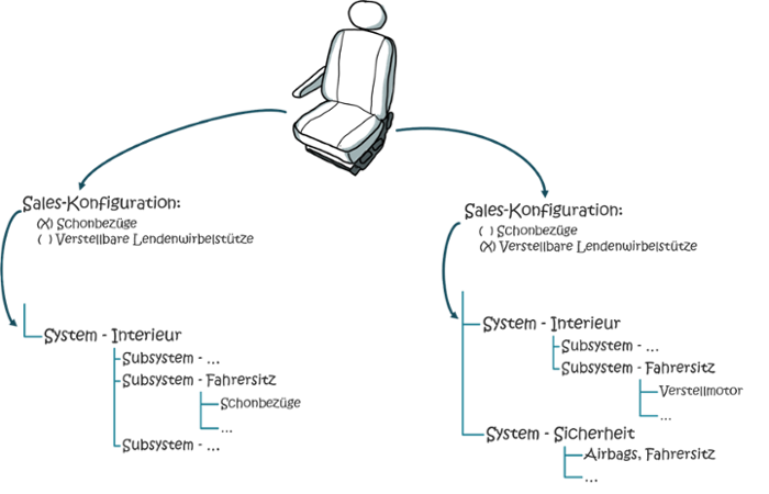 Für den Fall der Schonbezüge verhalten sich Sales-Konfiguration und die Entwicklungs-Konfiguration ähnlich und es wird lediglich eine zusätzliche Baugruppe hinzugefügt. Im Falle der verstellbaren Lendenwirbelstütze hat die Auswahl der Option hingegen Einfluss auf eine Vielzahl von varianten Modulen innerhalb der detaillierten Entwicklungsstückliste. So sind neben der Lendenwirbelstütze mit Stellmotor auch die Bedieneinheit für die Sitzeinstellung und die seitlichen Airbagsysteme betroffen.