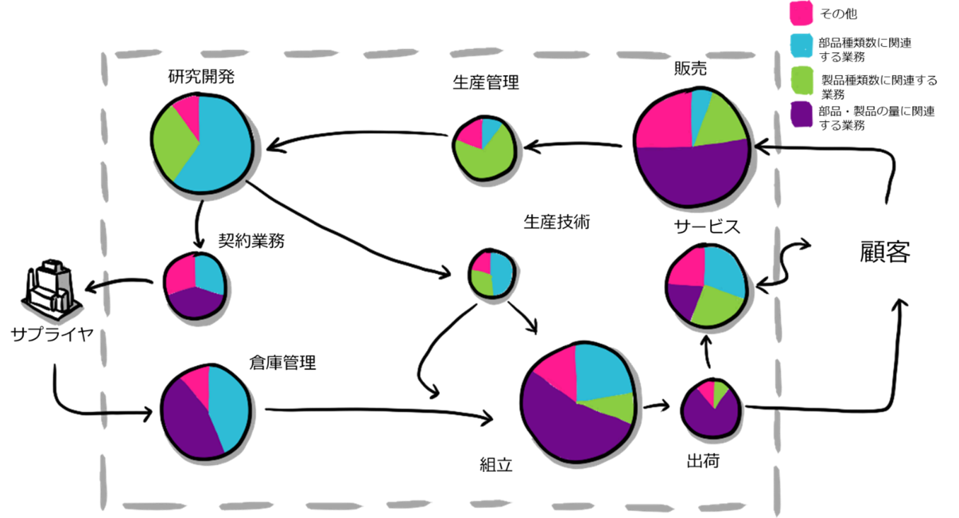 分析結果は、以下の図(バリューマップ)の様に示せます。図の通り、コストセンター(販管費部門)のほとんどが、複雑さに起因する活動を抱えています。例えば研究開発部門での製品文書作成や、CADモデルの作成です。提供する製品毎に生じる活動もあります。 例えば、個々の製品におけるマーケティング活動がこれに該当します。部品を取り扱う業務(調達、物流、生産など)は、部品や製品の量に応じて変化します。そして、中には製品の複雑さの影響を直接受けない活動もあります。