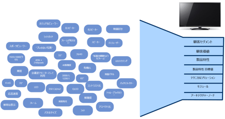 ここに掲げる三つの図はアーキテクチャーを構成するデータ群の整理のサンプルとして、LCDテレビの開発に対してどのような要件が考えられるかについて図示したものです。