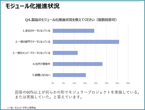 一般社団法人モジュラーデザイン研究会が2025年7月に実施したモジュラーに関するアンケートに「貴社の製品のモジュール化推進状況を教えてください」という項目があり、この回答結果をみると、60%以上の回答が、何らかの形でモジュラープロジェクトを実施ている。もしくは実施した。と読み取ることができます。