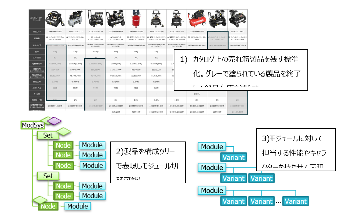- 製品の構成をストラクチャーで表現し、枝葉にバリエーションを持たせている